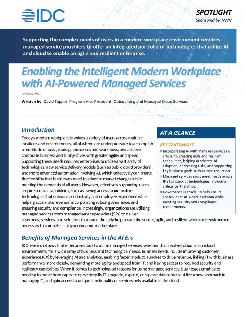 Supporting the complex needs of users in a modern workplace environment requires managed service providers to offer an integrated portfolio of technologies that utilize AI and cloud to enable an agile and resilient enterprise.